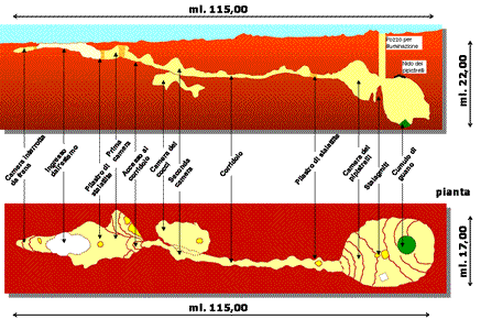 serie IV, Tomo III, Anno XXXIII, Luigi Battei, Parma, 1907, pagg. 7-22: “Circa un chilometro a mezzogiorno di Marzamemi, in una terrazza rocciosa insensibilmente degradante a mare, e da esso non guari discosta, si apre la bocca verticale della celebre grotta di Cala Farina, da tempo famosa ….. La grotta consta di un camerone centrale o principale con due recessi, e contorni di seni e sporgenze. Si accedeva un tempo al camerone per una specie di angusto lucernaio impetrale, poi allargato a colpi di mine; donde una massa di blocchi, taluni di grandi dimensioni, sovrapposti ad altri caduti “ab immemorabili…… …..Dal camerone centrale si staccano, in direzione diametralmente opposta, due gallerie; una duplice bocca in direzione Sud-Est è completamente ostruita dalla frana, e mi si disse conducesse a mare. Un'altra invece ancora libera corre in direzione Nord-Ovest….. …..il suo andamento è un po' tortuoso; dopo circa 10 metri si sprofonda in una camera di circa m. 17x8, dove raccolsi cocci e pezzi di anfore di età classica. La galleria prosegue di qui sempre in discesa ed angusta, in direzione Nord-Ovest, per una cinquantina di metri, dopo di che arriva in una specie di rotonda di m. 30x20, che calcolai si trovasse a m. 25 dal piano di campagna. Qui finisce la grotta, che da sud-Est a Nord-Ovest ha uno sviluppo lineare di quasi un centinaio di metri;……” |